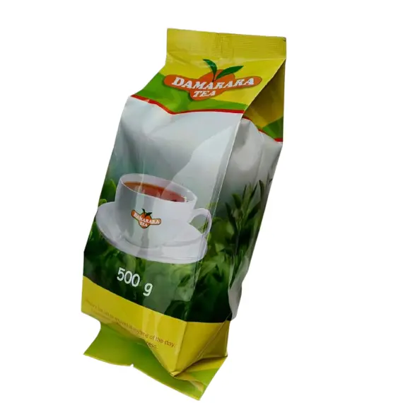 Damarara Tea is a premium black tea product, thoughtfully packaged in a stand-up pouch weighing 500 grams. The packaging is eye-catching, primarily in shades of bright yellow and green, evoking a sense of natural freshness. The front of the pouch prominently displays the "DAMARARA TEA" brand name, accompanied by a stylized logo featuring tea leaves. A key visual element is a pristine white teacup filled with rich, amber-colored tea, set against a backdrop of lush green tea plantations, suggesting the natural origin of the product. The phrase "500 g" is clearly visible, indicating the net weight. Below this, there's a smaller text that appears to read "Damarara Tea can be enjoyed at anytime of the day," emphasizing its versatility and appeal for any occasion. The overall design communicates quality, freshness, and the enjoyable experience of a good cup of tea.