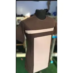 This is a stylish short-sleeve men's shirt with a modern design. The shirt is primarily brown with a prominent rectangular cream panel on the front, extending vertically from the chest to the hem. A horizontal cream stripe runs across the chest, creating a clean, geometric look. The shirt has a...