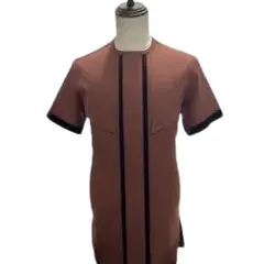 Fashionable short-sleeve men's shirt in a rich brown color with black accents. The shirt features a unique front design with two vertical black stripes running down from the chest to the hem, and angled chest seam details that add structure. Black trimming on the sleeve cuffs provides a sharp...