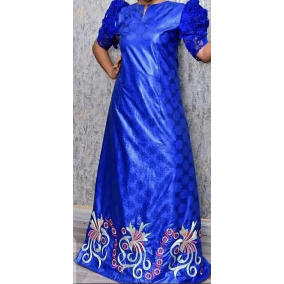 Our beautiful women's long dress made from a rich, royal blue fabric. The dress features a round neckline with a small slit at the front and short puffed sleeves made from lace material, adding an elegant and delicate touch. The main body of the dress has subtle floral or circular patterns woven into the fabric, giving it textures and depth, our dress Creating a graceful and modest look, perfect for formal occasions or cultural events.