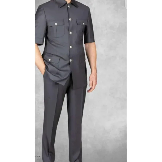 a men’s short-sleeve suit in a dark color, likely black or charcoal gray. Our suit features a short-sleeved jacket with a structured, tailored fit and a straight cut, paired with matching trousers. The jacket has a button-down front and four flap pockets with buttons—two on the chest and two at the waist—giving it a formal yet slightly Rwandan style. The overall look is polished, modern, and suitable for formal or semi-formal occasions in warm weather.