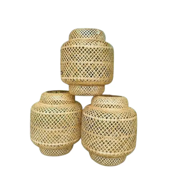 Beautifully handcrafted cylindrical jars made from natural bamboo, featuring an intricate open-weave pattern. Ideal for home décor, storage, or as unique gift items