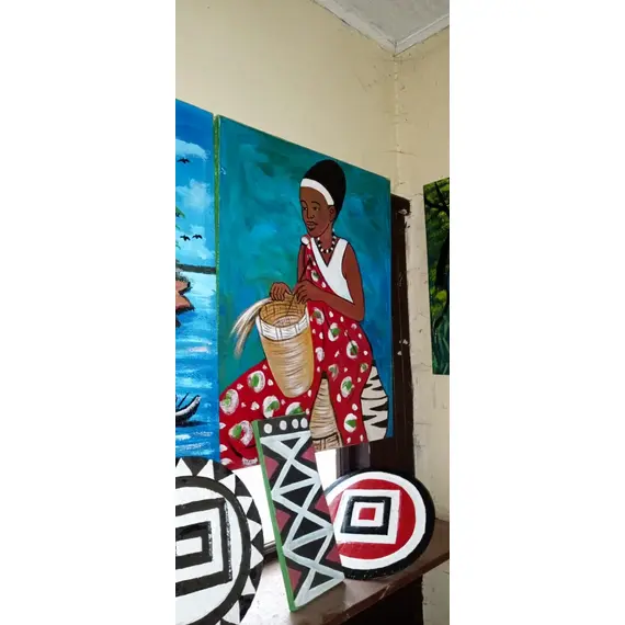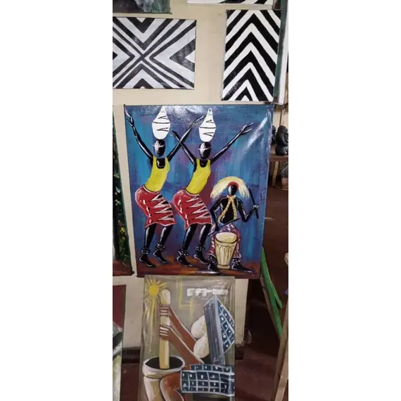 Hand Painted, Celebrite the vibrant spirit of rwandan culture with this hand painted artwork depicting traditional culture, the background patterns and additional paintings symbolize both rural life and modern growth  perfect for home decor, cultural spaces or art collectors who value african heritage