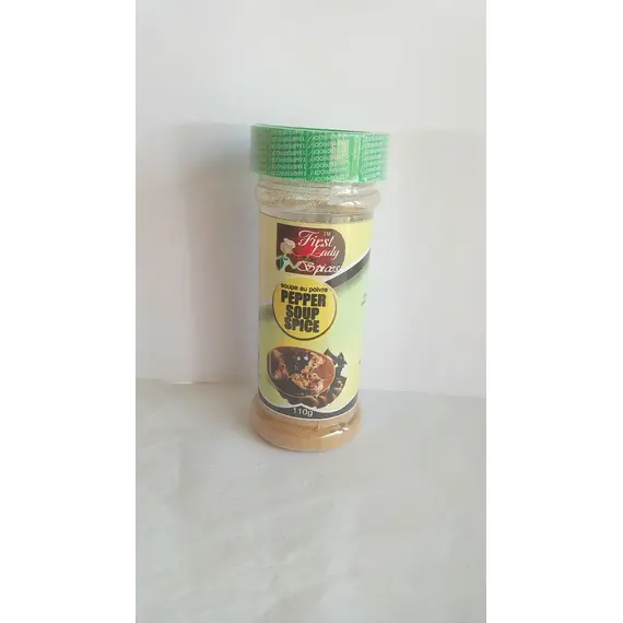 First Lady Pepper Soup Spice is 100% it mixed product content no extra additives. Ashanti pepper, Cloves, Ginger, Calabash, uziza.