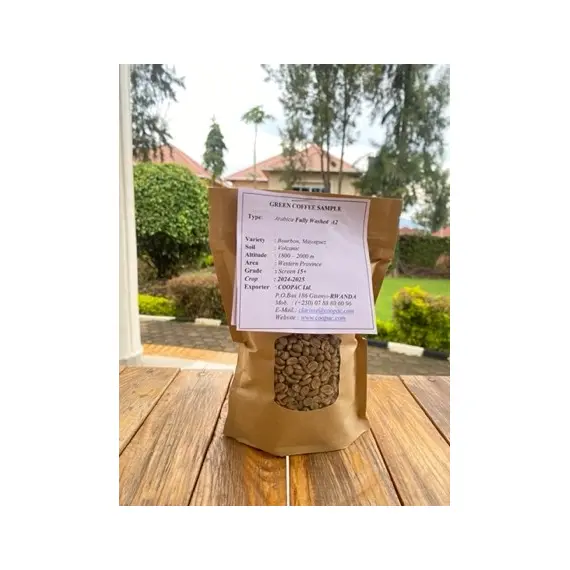 Grade & Quality: Premium A2 grade green coffee beans, fully washed for a clean, refined flavor.Sourced from Volcanic Soil: Grown in the nutrient-rich volcanic soils of Rwanda’s Western Province, renowned for producing coffee with rich, complex taste profiles.High-Altitude Harvest: Cultivated at an elevation of 1800-2000m, resulting in slow-ripening beans with enhanced flavor, sweetness, and acidity balance.Eco-Friendly & Sustainable: Ethically sourced from local Rwandan farmers practicing sustainable agriculture, supporting rural livelihoods and environmental protection.Exceptional Value: Available at just $8.3/Kg FOT Kigali, offering outstanding value for roasters, distributors, and specialty coffee enthusiasts.